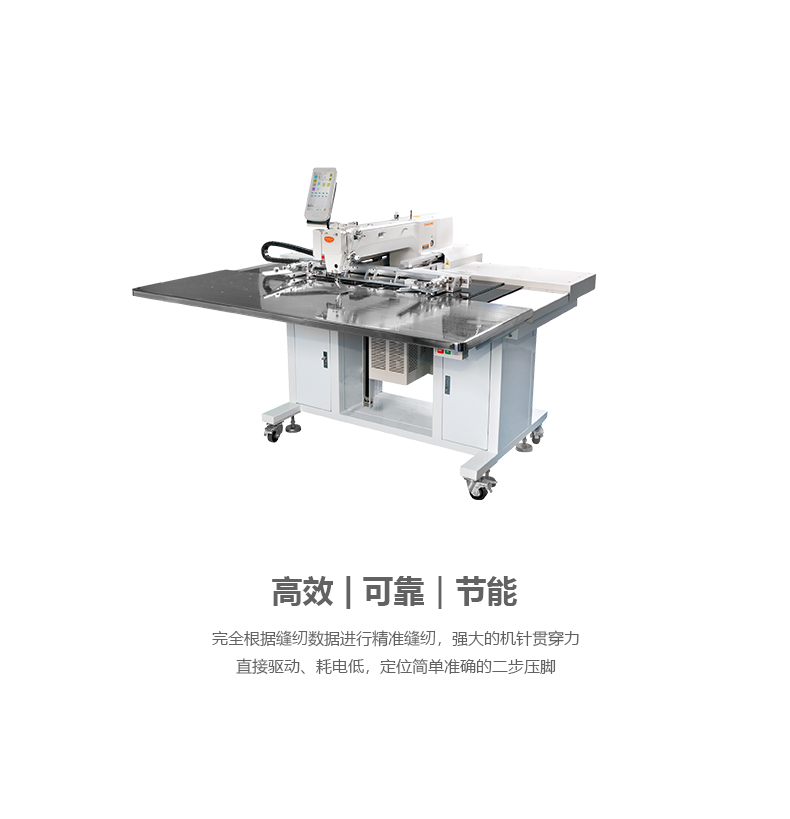 宽大的缝制区域实现多样化缝纫,可同时缝制鞋类和衣物的多个小物件的组合缝纫,同时,也 可以缝纫皮包和汽车内饰及安全气囊等大的缝制物品。搭载550W伺服电机,强大的机针贯穿力 在低速时厚料也能缝出精美的线迹。
