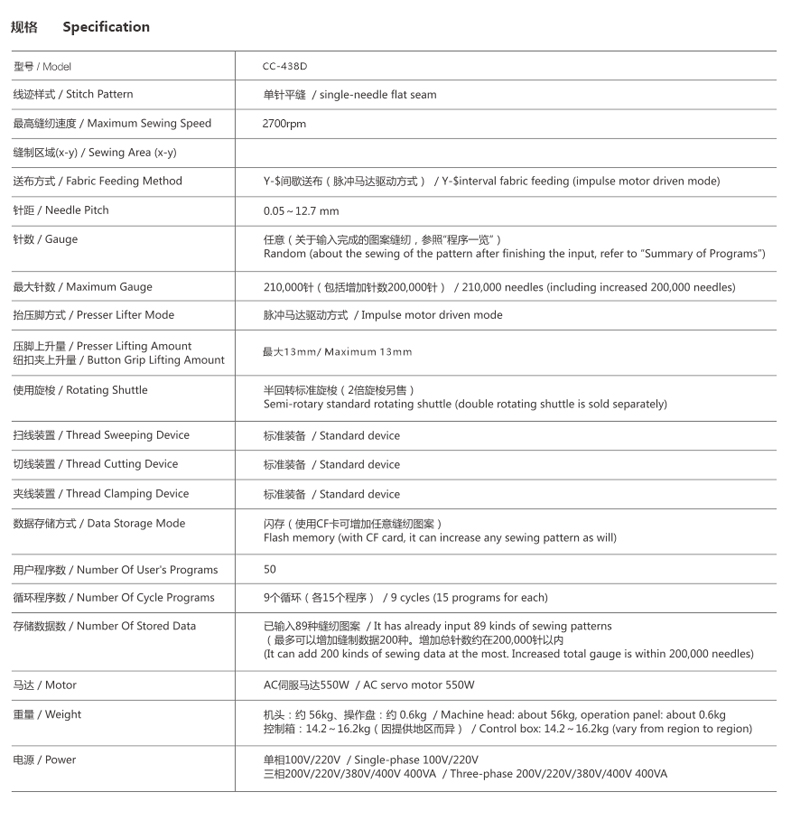 Sewing speed :2700rpm The largest sewing area: 6.4~6.4 mm The max height of presser:13mm Sway hook 90 patterns has been saved in the machine